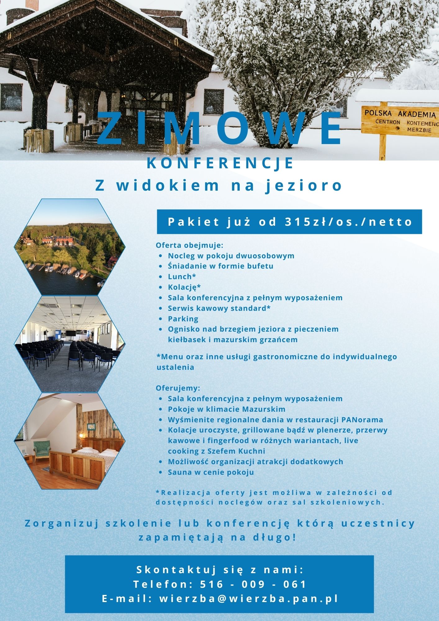 Do Państwa dyspozycji oddajemy 2 sale konferencyjne wyposażone w sprzęt audio-wizualny i bezprzewodowy dostęp do internetu. Większa z sal mieści do 200 osób. Sale są klimatyzowane, istnieje też możliwość ich zaciemnienia. Zapewniamy profesjonalną obsługę konferencji. Dodatkowo dysponujemy salą kominkową oraz salami, w których istnieje możliwość zorganizowania spotkań w mniejszym gronie, sesji posterowych lub przeprowadzenia kameralnych dyskusji panelowych.